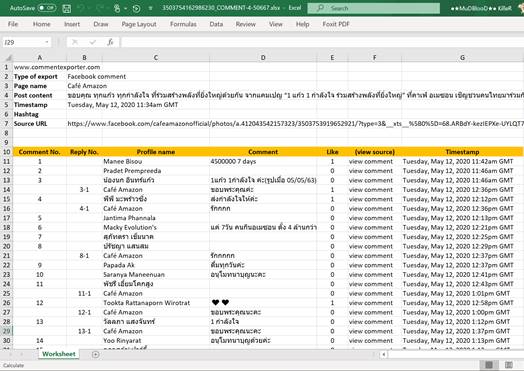 ไฟล์ Excel ที่ได้ ข้อมูลจะถูกแบ่งออกเป็น ลำดับในการคอมเมนต์ รวมถึงคนที่มาตอบ reply คอมเมนต์ด้วย ชื่อผู้คอมเมนต์ ข้อความคอมเมนต์ จำนวน Like หรือจำนวน Reaction (ทั้งการกด like, love, care ฯลฯ) เวลาที่คอมเมนต์และเวลาที่มีการแก้ไขคอมเมนต์ล่าสุดด้วย และยังสามารถคลิกเข้าไปดูคอมเมนต์ต้นฉบับได้ด้วยการกด view comment