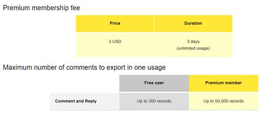 commentexporter นี้สามารถ Export comment ได้ฟรีถึง 300 คอมเมนต์ ถ้าในโพสต์ของเรามีจำนวนคอมเมนต์มากกว่า 300 คอมเมนต์ จะมีค่าใช้จ่ายในการ Export 3 USD หรือประมาณ 90 บาทต่อการใช้งานไม่จำกัดจำนวนครั้งในระยะเวลา 3 วันและสามารถ Export ได้สูงสุดถึง 50,000 คอมเมนต์ต่อครั้ง